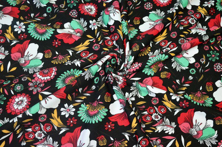 A differenziare la stoffa è la splendida fantasia floreale che unisce innumerevoli colorazioni le quali vivacizzano e decorano armoniosamente il fondo a tinta unita nero.