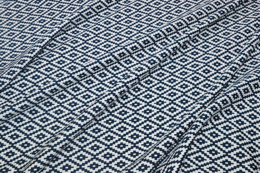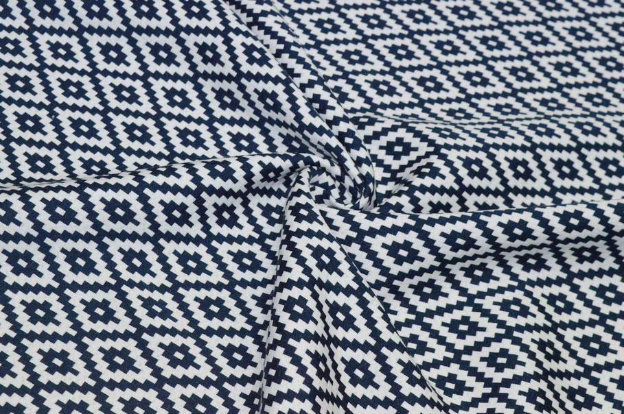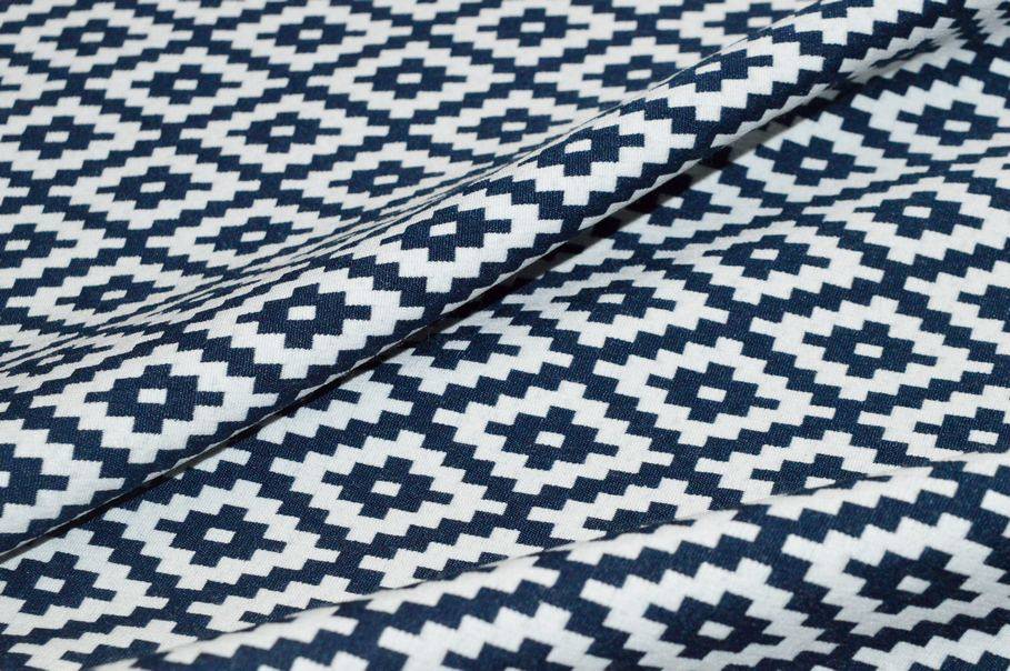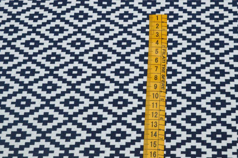 Il fondo bianco mette in risalto il motivo geometrico blu composto da rombi in stile tribale di 2,5x4,5 cm ciascuno.