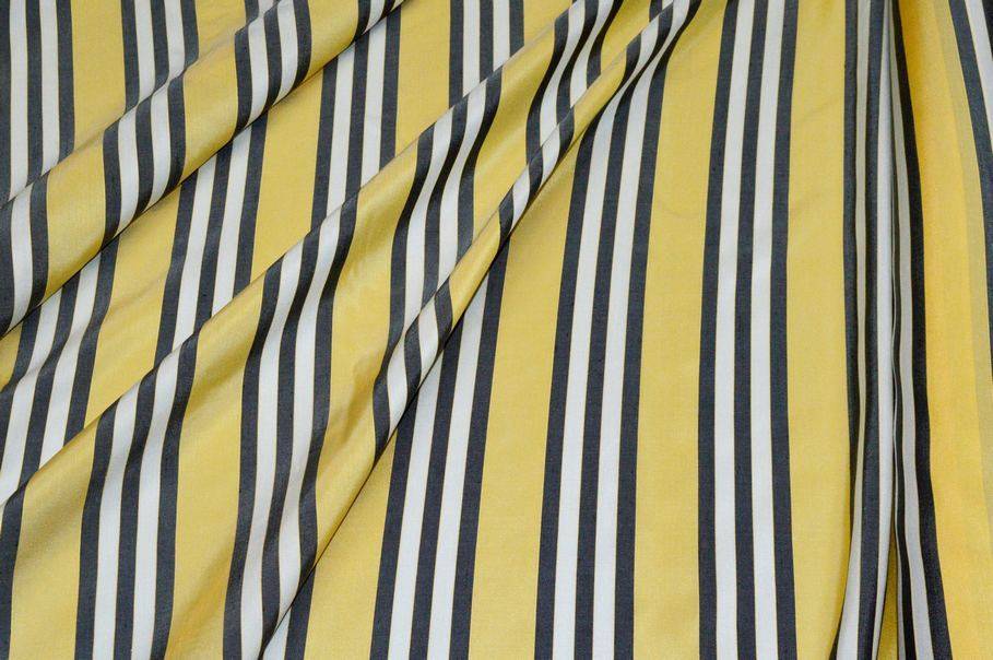 Il fondo mostra un delicato e raffinatissimo effetto shantung dato dalla presenta di lievi e sottili fiammature tipiche di questa lavorazione. Viene decorato infine dal motivo a righe il quale alterna bande verticali gialle, bianche e nere.
