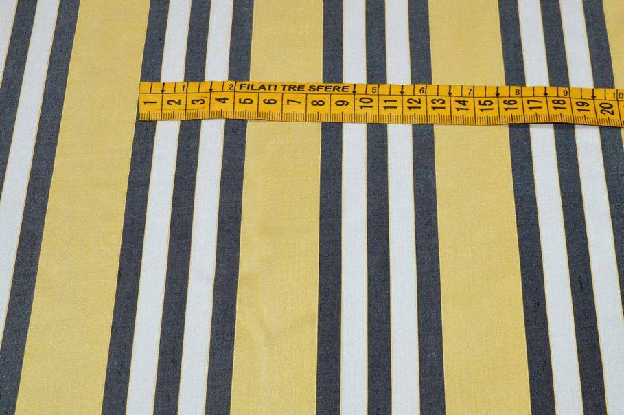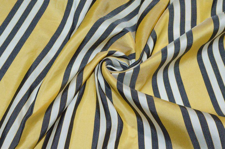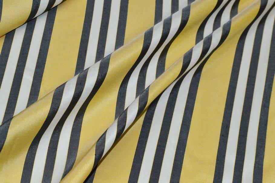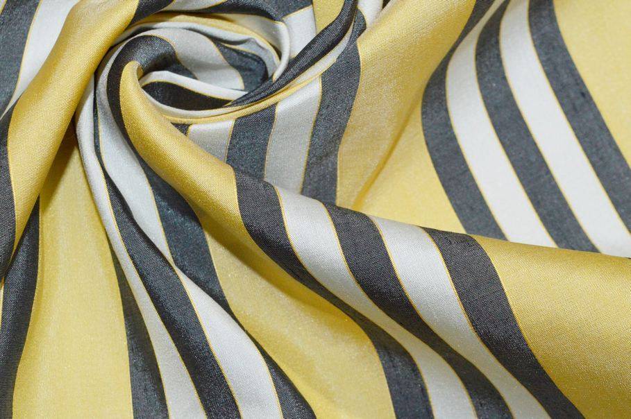 Il fondo mostra un delicato e raffinatissimo effetto shantung dato dalla presenta di lievi e sottili fiammature tipiche di questa lavorazione. Viene decorato infine dal motivo a righe il quale alterna bande verticali gialle, bianche e nere.