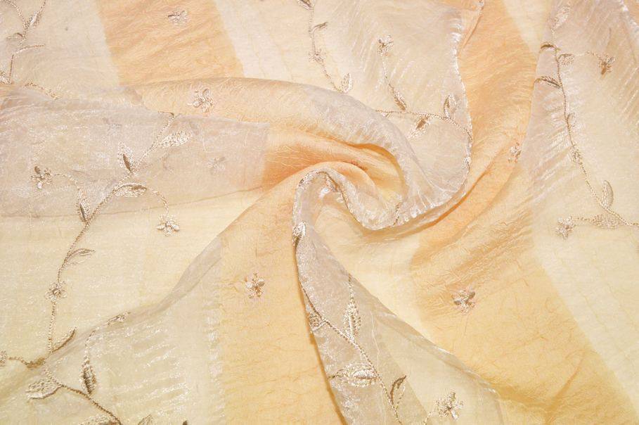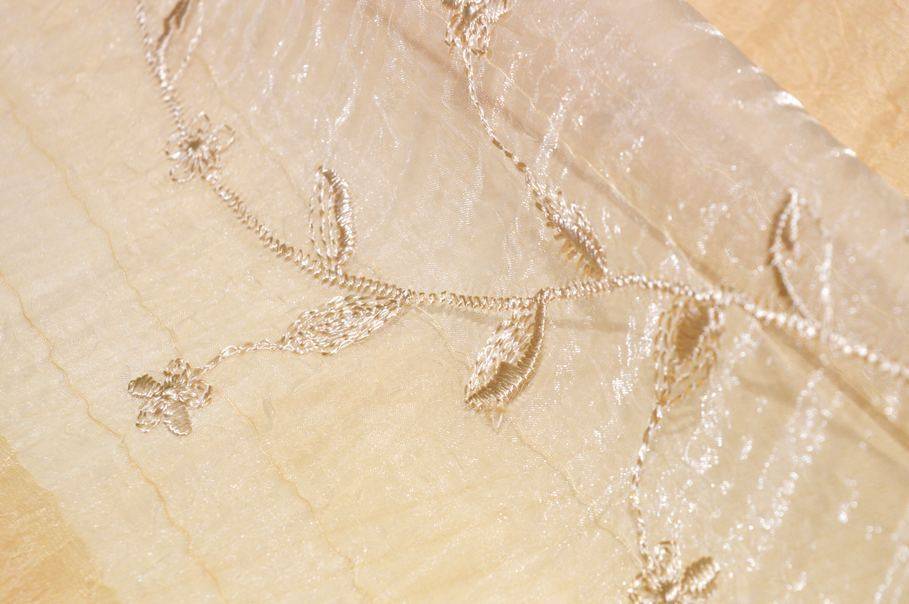 Il fondo viene realizzato con della bellissima organza beige dal sottotono caldo tendende al dorato e viene suddiviso da fasce più e meno coprenti. Le fasce trasparenti, oltre a far passare la luce, mettono in mostra un raffinatissimo ricamo dorato raffigurante minuti ed esili fiorellini. Preziosa ed elaborata, ma allo stesso tempo classica ed elegante rappresenta un vero e proprio elemento d'arredo altamente lussuoso. Realizzato con base in organza presenta una mano molto leggera e trasparente. La leggerezza del prodotto lo rende un articolo perfetto per arredare ambienti con poca illuminazione.