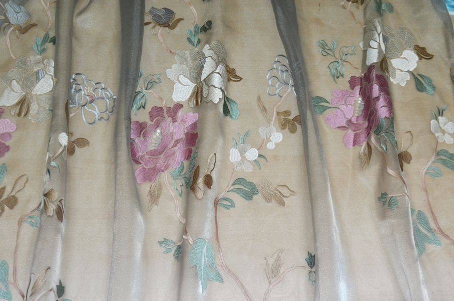 Tessuto per tende con leggero e trasparente fondo in organza il quale viene amato e scelto per ottenere delle arricciature ricche, voluminose e sinuose. La colorazione della base è un delicato grigio leggermente luminoso tipico delle stoffe in organza. A differenziare questa tenda da altri prodotti è il suo design unico ed originale composto da un ricamo floreale che si estende verticalmente sulla stoffa. Il ricamo parte a 45 cm dalla cimosa inferiore e si sviluppa per 140 cm lasciando poi nuovamente dello spazio scoperto fino alla cimosa superiore.