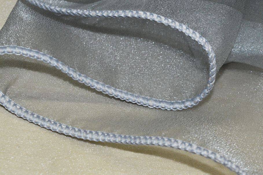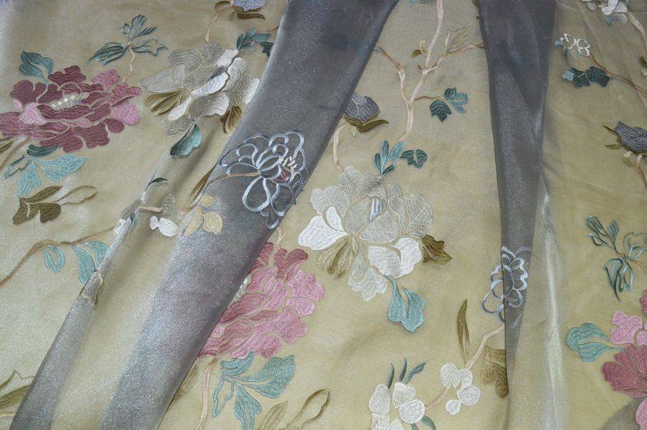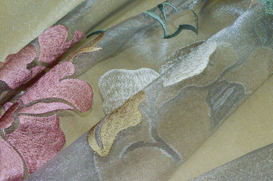 Tessuto per tende con leggero e trasparente fondo in organza il quale viene amato e scelto per ottenere delle arricciature ricche, voluminose e sinuose. La colorazione della base è un delicato grigio leggermente luminoso tipico delle stoffe in organza. A differenziare questa tenda da altri prodotti è il suo design unico ed originale composto da un ricamo floreale che si estende verticalmente sulla stoffa. Il ricamo parte a 45 cm dalla cimosa inferiore e si sviluppa per 140 cm lasciando poi nuovamente dello spazio scoperto fino alla cimosa superiore.