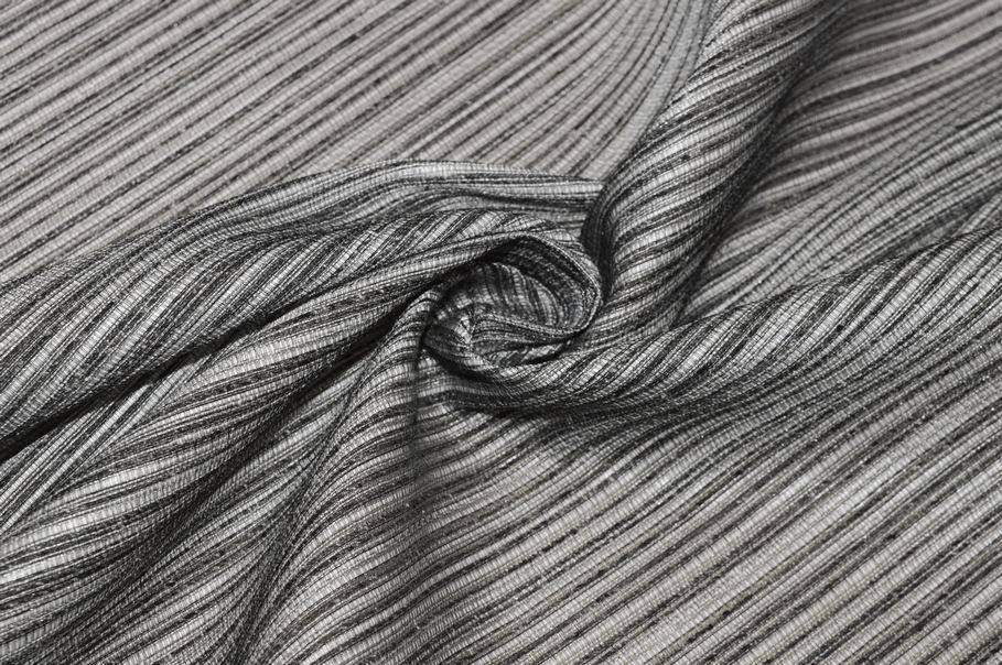 Particolare tessuto per tende caratterizzato da un'originale trama leggermente in rilievo composta da sottili righe verticali nere abbinate a differenti grazioni di grigio. Dal design fine e minimale trova facilmente posto negli ambienti dall'impronta moderna.