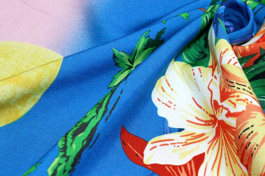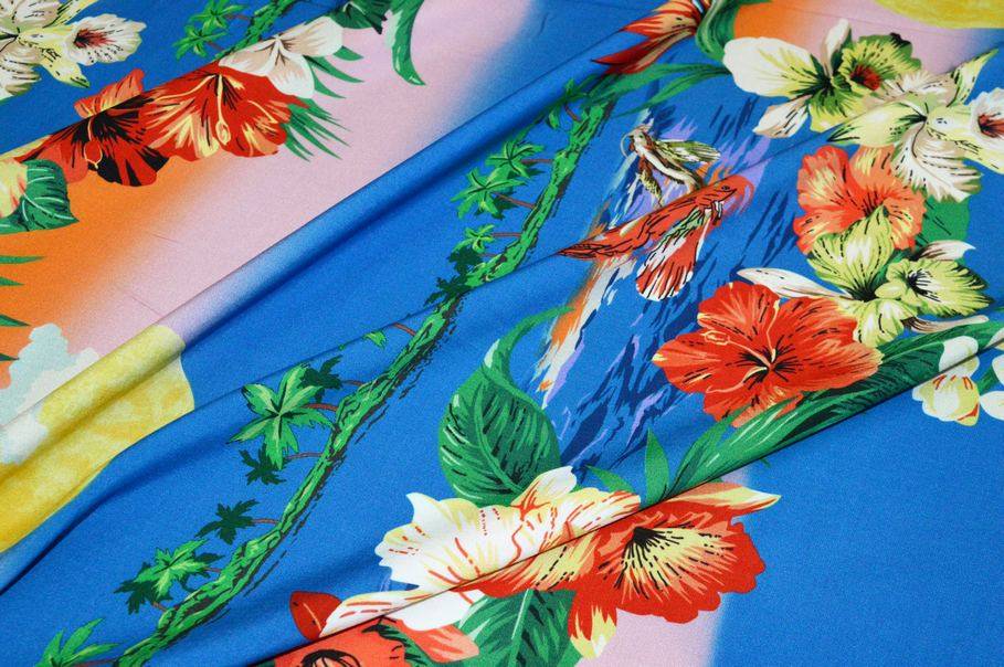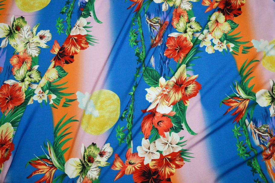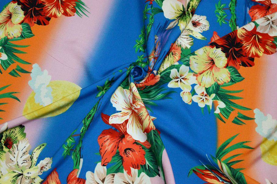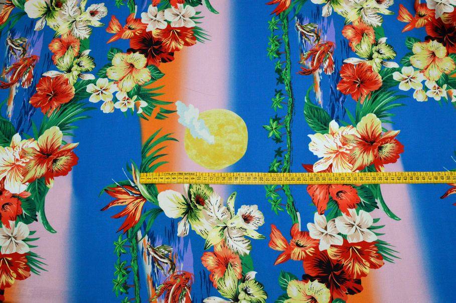 La fantasia di questa stoffa è un mix di innumerevoli colorazioni dove tonalità neutre e delicate come il bianco ed il rosa si uniscono armoniosamente alla vivacità dell'azzurro, del rosso e del verde creando un vero e proprio paesaggio scenico.