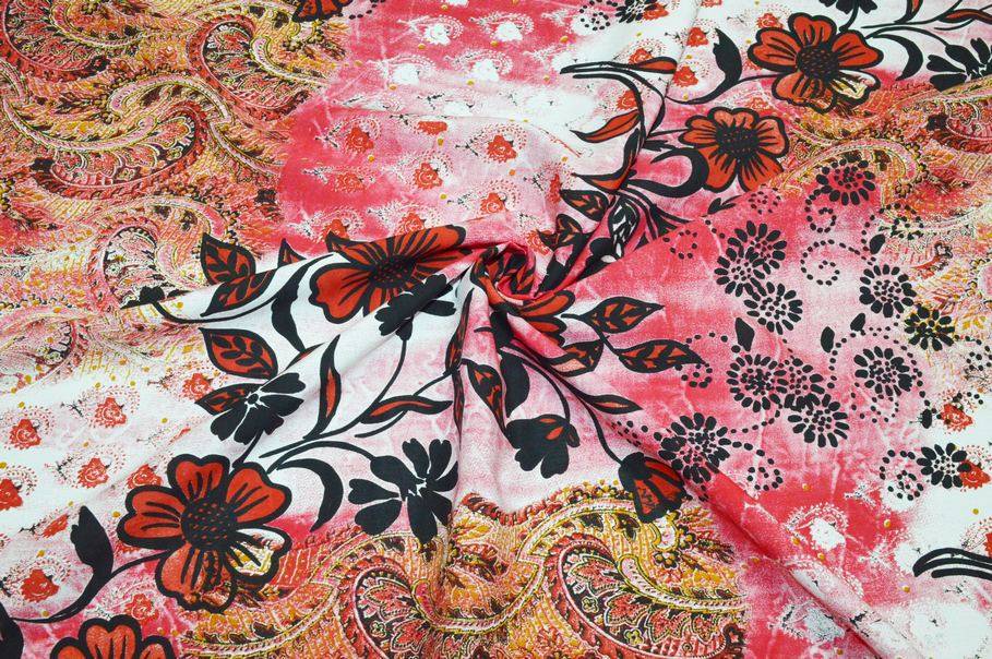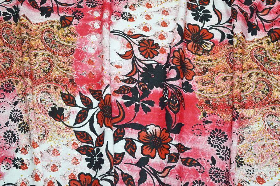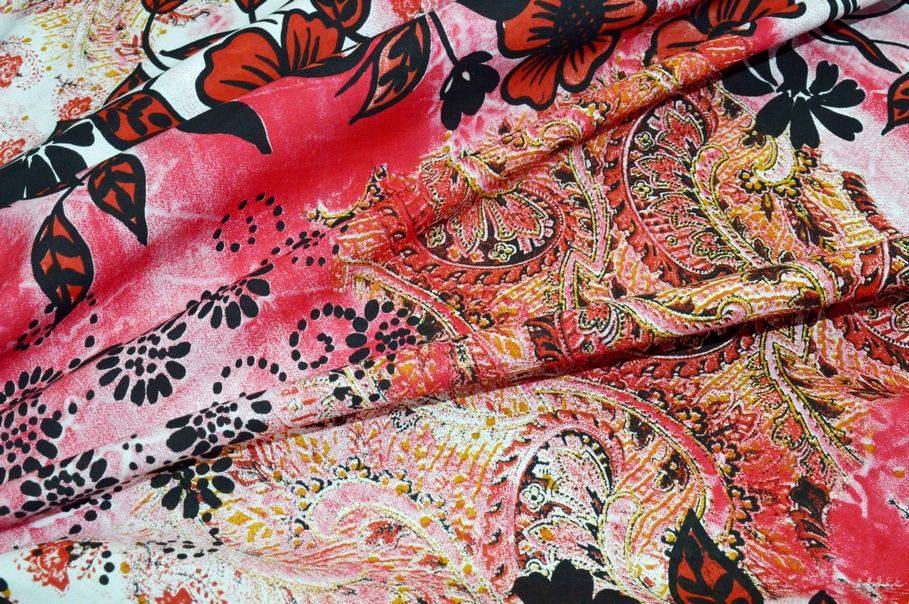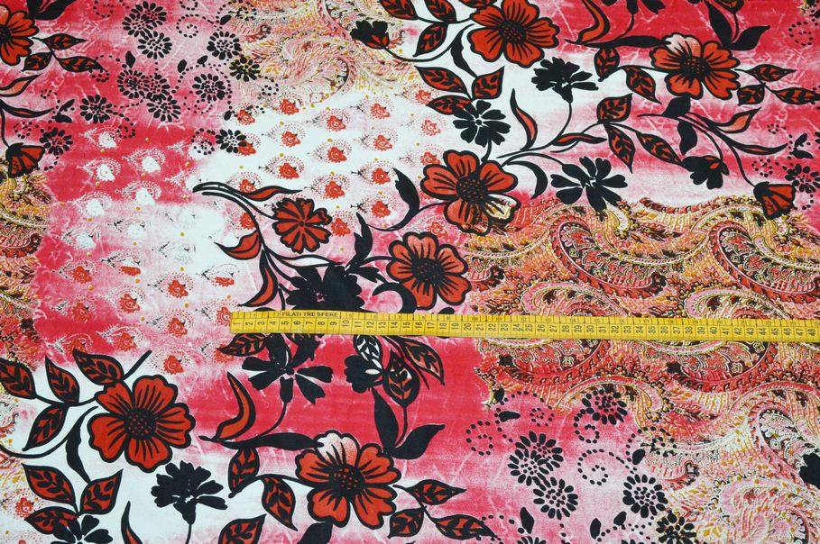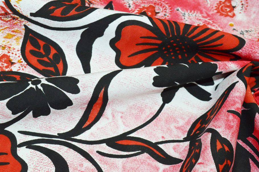 Tessuto popeline di puro cotone caratterizzato da una particolarissima fantasia che nasce dall'unione di più disegni dove l'eleganza del floreale viene accostata alla giocosità di altre figure stilizzate. Il fondo non presenta una sola tonalità, bensì prende vita attraverso bellissime sfumature che vanno dal rosso all'arancio.