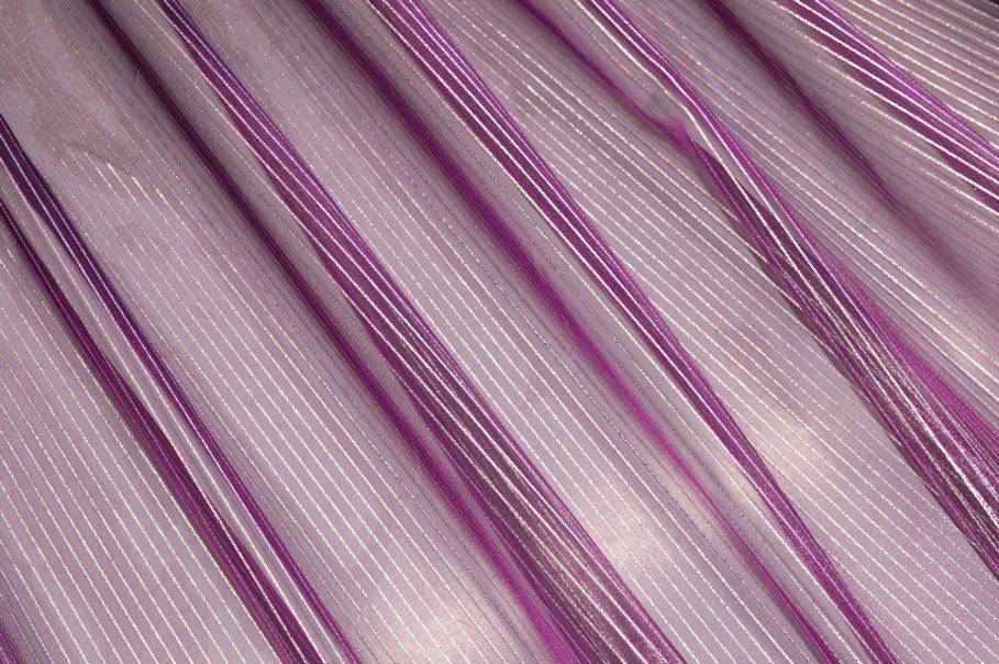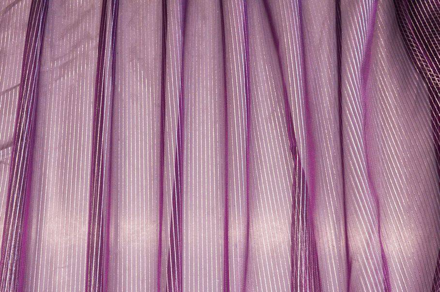 La colorazione scelta per il fondo è un particolarissimo viola che viene impreziosito da un sottile righino argenteo il quale dona alla stoffa un luccichio prezioso ed elegante. Realizzato con base in organza presenta una mano molto leggera, voluminosa e trasparente. La leggerezza del prodotto lo rende un articolo perfetto per arredare ambienti con poca illuminazione poiché la luce naturale filtrerà molto facilmente.