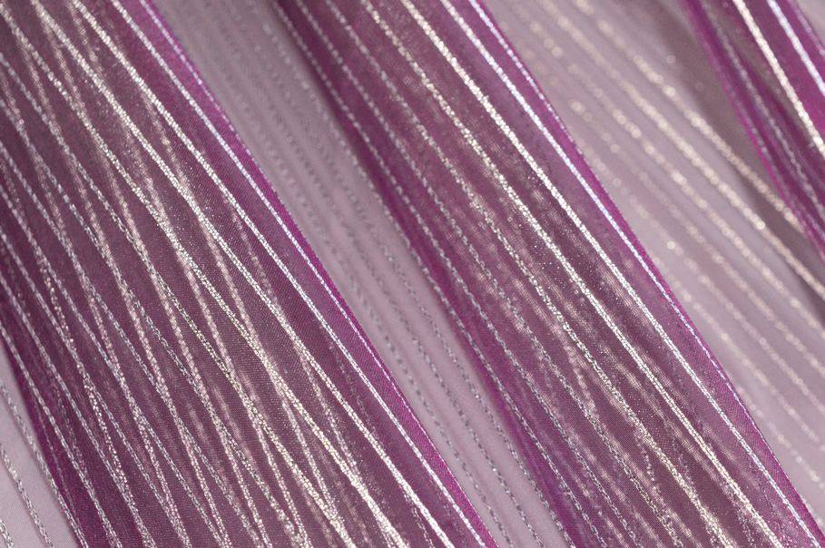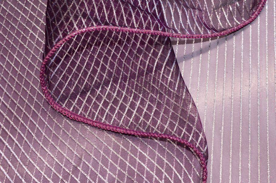 La colorazione scelta per il fondo è un particolarissimo viola che viene impreziosito da un sottile righino argenteo il quale dona alla stoffa un luccichio prezioso ed elegante. Realizzato con base in organza presenta una mano molto leggera, voluminosa e trasparente. La leggerezza del prodotto lo rende un articolo perfetto per arredare ambienti con poca illuminazione poiché la luce naturale filtrerà molto facilmente.