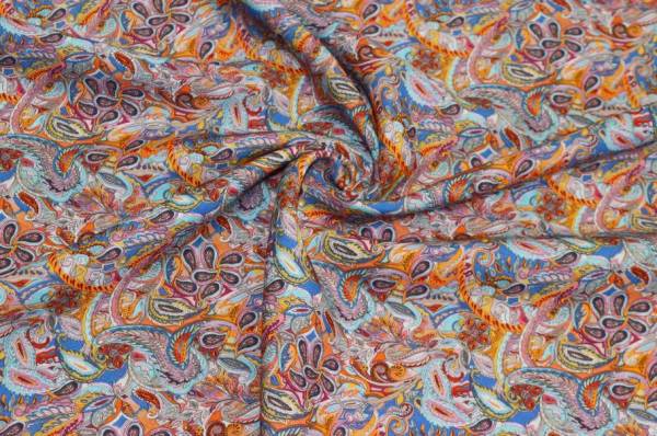 Ad abbellire la stoffa troviamo inoltre il coloratissimo ed iconico motivo cashmere composto da molteplici gradazioni di arancio che si uniscono armoniosamente a dettagli blu.