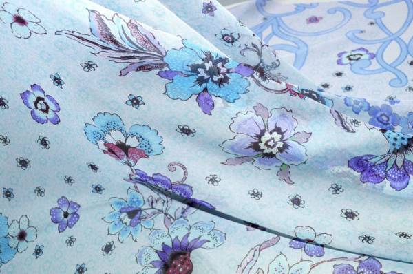La colorazione scelta per il fondo è un delicatissimo azzurro chiaro vivacizzato da molteplici gradazioni di viola e blu che decorano la stoffa con bellissimi dettagli fiorati.
