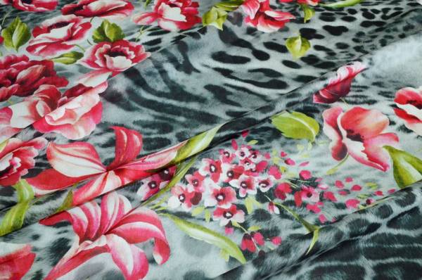 Il pannello misura 140x135 cm e vanta di una bellissima fantasia piazzata che riesce ad unire perfettamente l'eleganza delle stoffe floreali all'accattivante ed iconico motivo animalier per un design rappresentativo dell'alta moda. Indicato per confezionare top e camicette, abitini corti e lunghi, eleganti foulard e stole coprispalle.