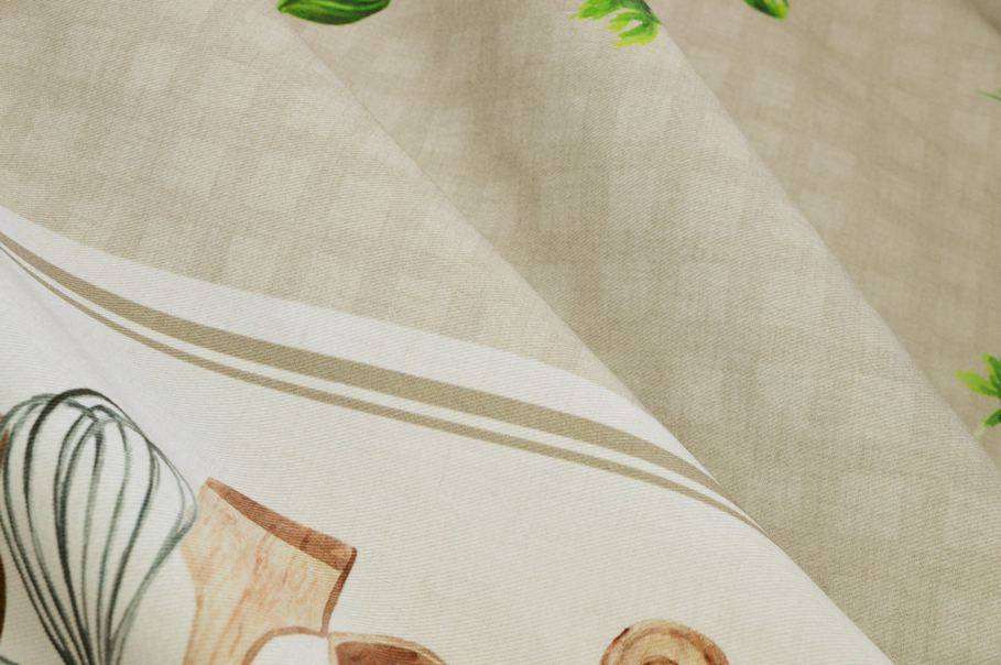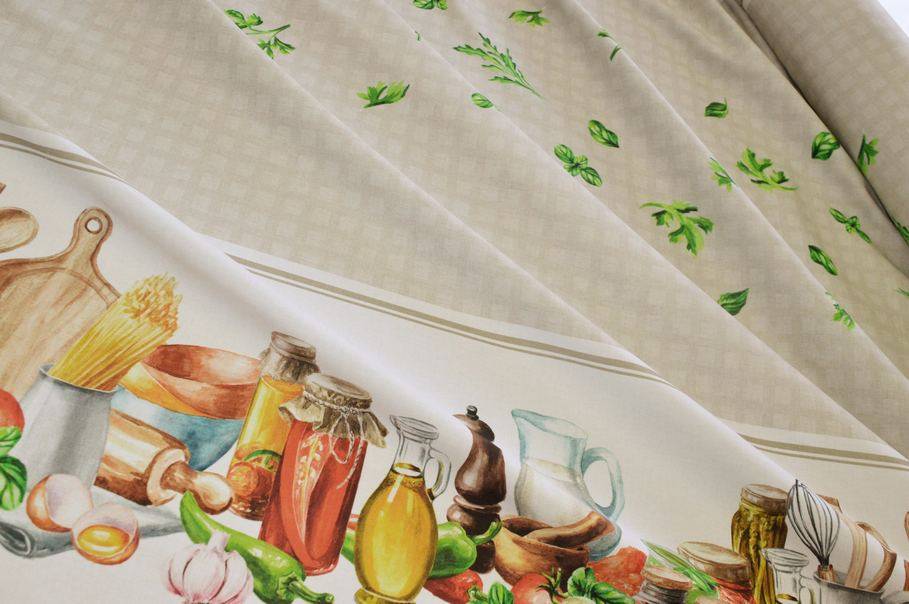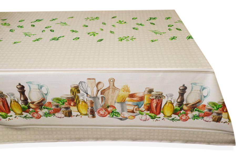 La banda centrale della tovaglia (larga 72 cm) si presenta beige e viene decorata da una piccola quadrettatura leggermente più scura composta da schacchetti di 1,3x1,5 cm ciascuno. Ai lati vi sono invece due fasce con stampa decorativa a tema cucina dove è possibile ammirare un armoniosa composizione colorata.
