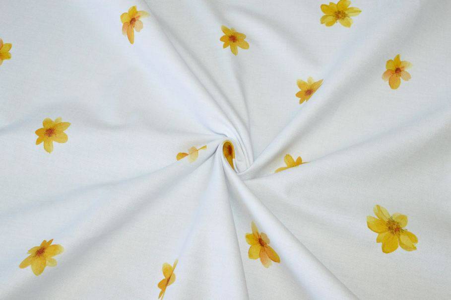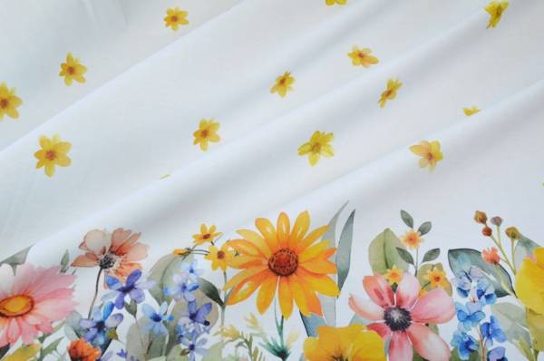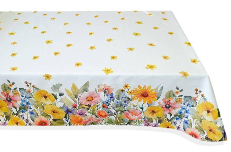 La banda centrale della tovaglia (larga 108 cm) mette a disposizione un candido fondo bianco il quale viene decorato da piccoli fiorellini gialli cosparsi su tutta la lunghezza. Ai lati viene invece incorniciata da due coloratissime fasce floreali alte 26 cm ciascuna.