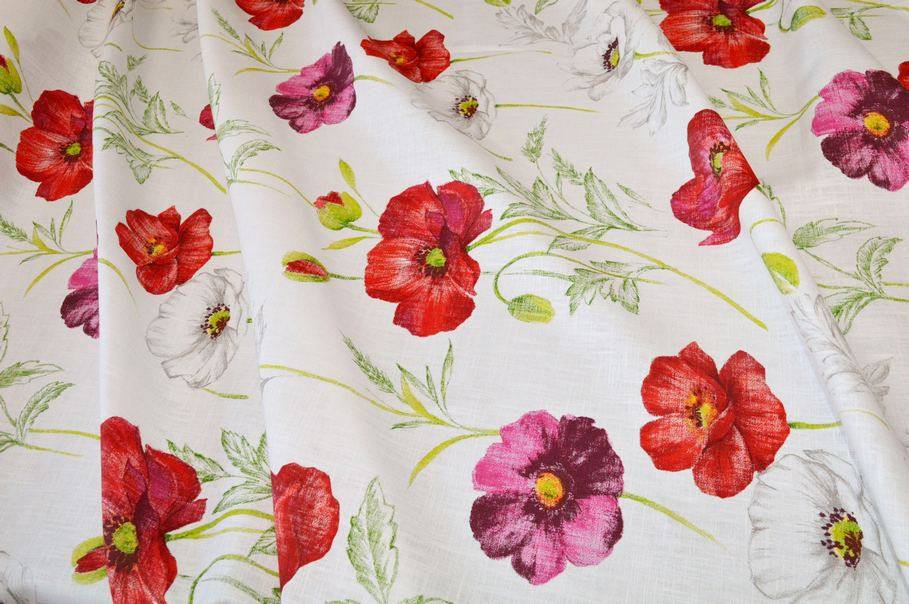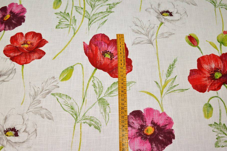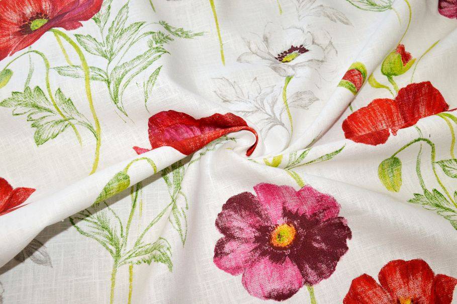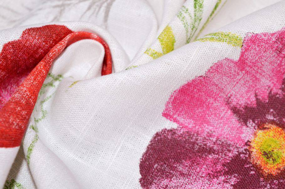 In questo caso il fondo bianco lascia a vista la bellissima trama che caratterizza le stoffe di lino e fa spiccare la raffinatissima fantasia floreale. Il disegno è un'esplosione di colori intensi ed acattivanti, ottimi per rinnovare l'ambiente e dare frescheza alla stanza.