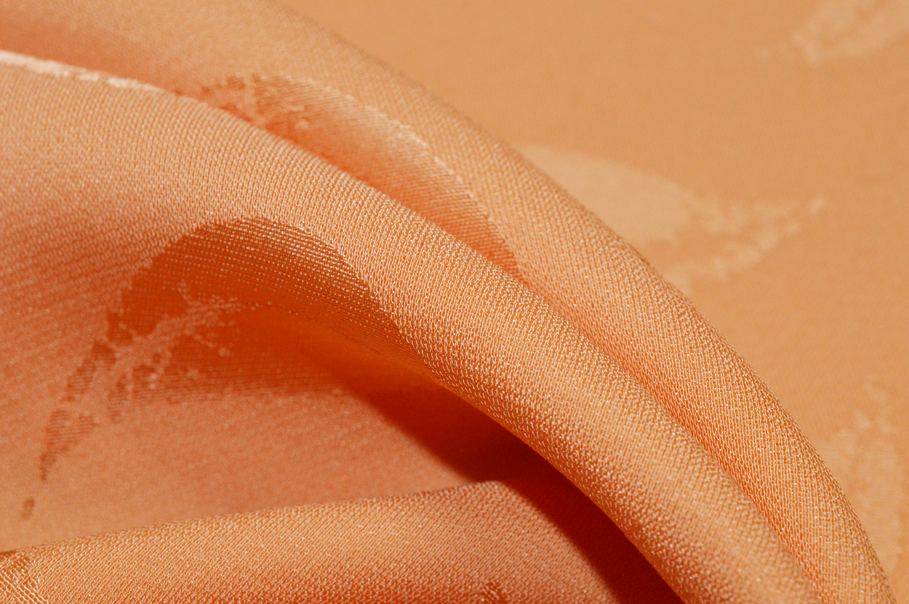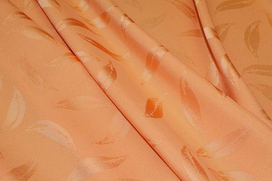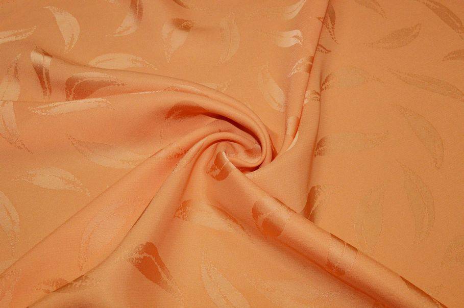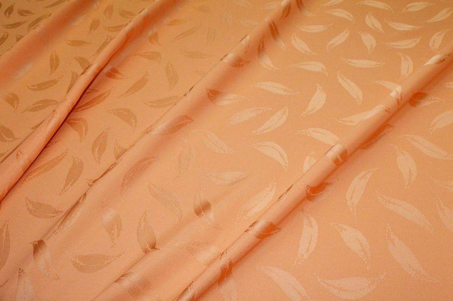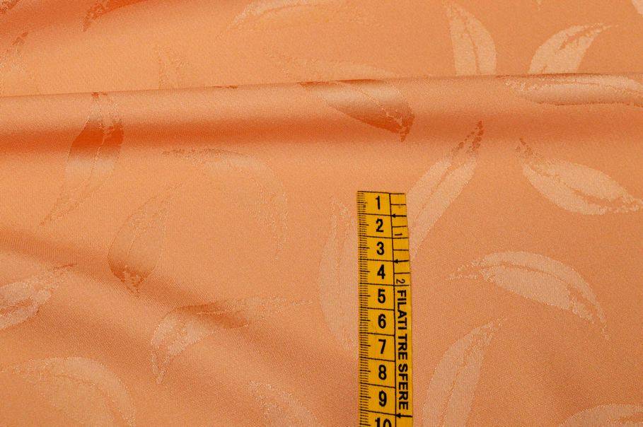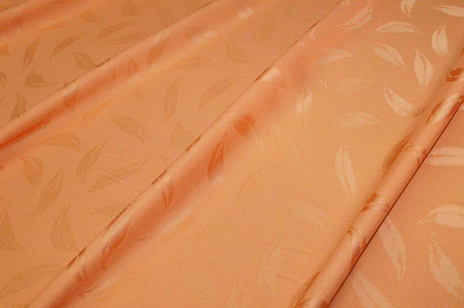 Il tessuto rasato jacquard viene caratterizzato da un fondo liscio e coprente color pesca dall'aspetto lucente, tipico delle stoffe in raso. Questa superficie luminosa contribuisce ad aumentare l'eleganza e la raffinatezza della stoffa che già in partenza sfoggia una bellissima lavorazione jacquard in tono a tema naturalistico raffigurando piccole foglie.
