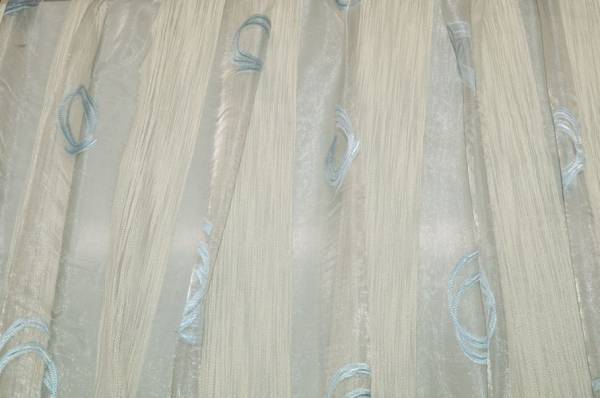 Il nostro tessuto in organza viene ideato e favorito nella confezione di tendaggi poiché grazie alla sua mano cadente, voluminosa, svolazzante e leggera permette di realizzare tende dalle linee morbide e dolci, ma anche con arricciature ricche e voluminose. Il fondo viene suddiviso in fasce verticali di differente coprenza le quali favoriscono l'illuminazione della stanza lasciando filtrare la luce, senza pero intaccare la privacy dell'ambiente. Le bande più coprenti presentano una trama evidente color panna, mentre quelle più velate vengono arricchite da applicazioni geometriche azzurre.
