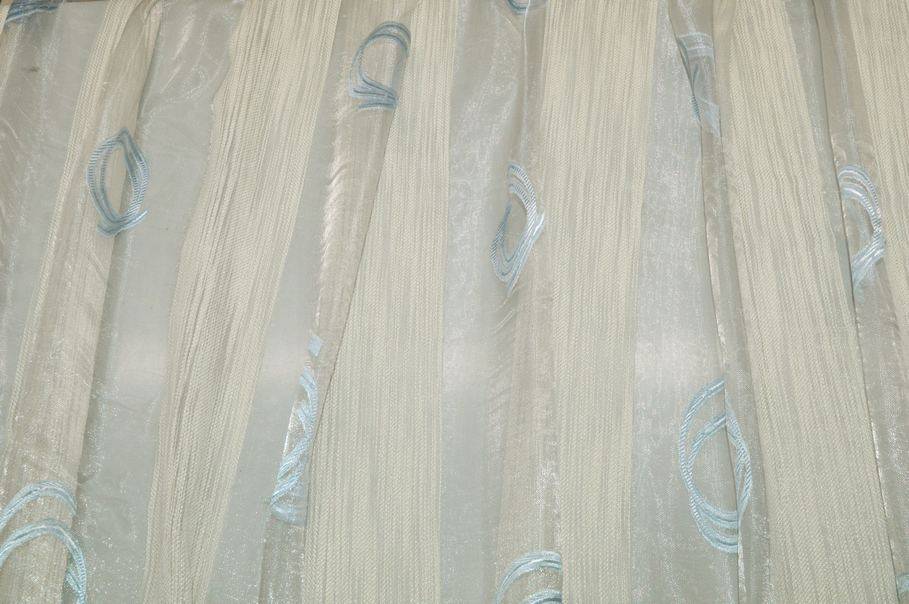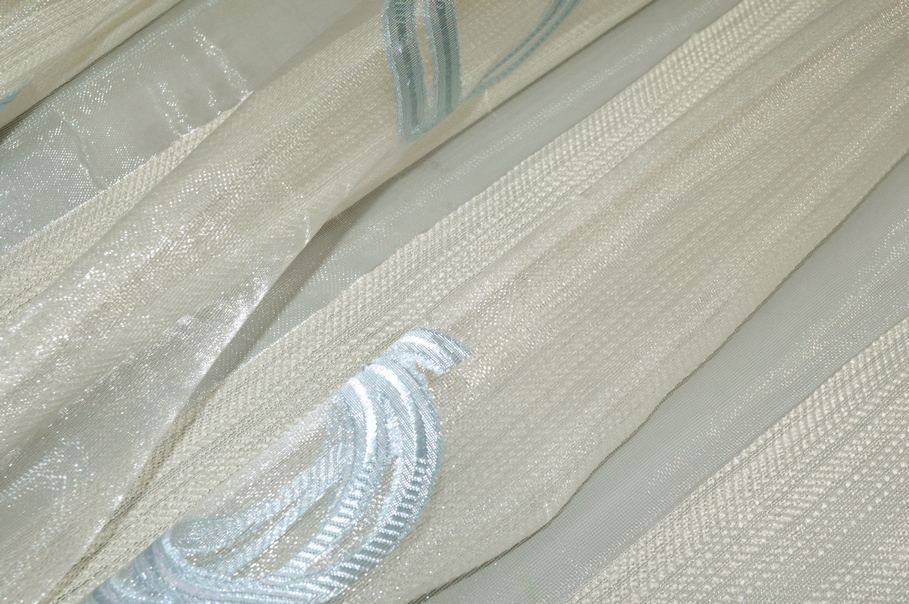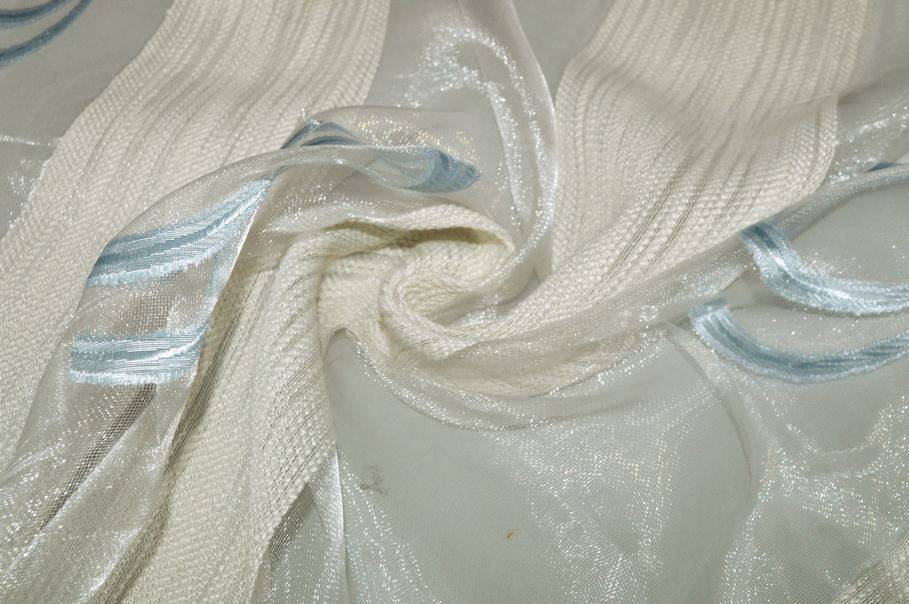 Il nostro tessuto in organza viene ideato e favorito nella confezione di tendaggi poiché grazie alla sua mano cadente, voluminosa, svolazzante e leggera permette di realizzare tende dalle linee morbide e dolci, ma anche con arricciature ricche e voluminose. Il fondo viene suddiviso in fasce verticali di differente coprenza le quali favoriscono l'illuminazione della stanza lasciando filtrare la luce, senza pero intaccare la privacy dell'ambiente. Le bande più coprenti presentano una trama evidente color panna, mentre quelle più velate vengono arricchite da applicazioni geometriche azzurre.