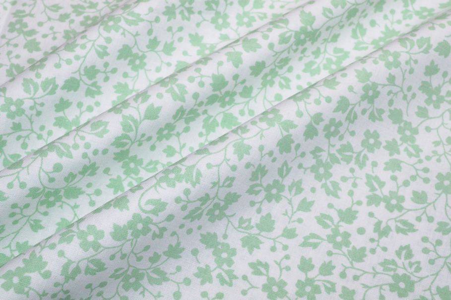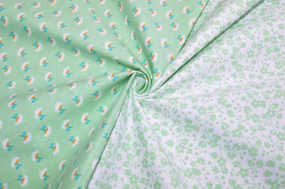 Tessuto di puro cotone con fantasie a tema primaverile abbinabili tra loro. Il primo disegno presenta un candido fondo bianco che mette in evidenza i delicati e minuti fiorellini color verde pastello che decorano la stoffa a campo pieno. La seconda fantasia invece inverte la posizione dei colori collocando il verde pastello sul fondo. Misura fiori 1x1 cm circa.