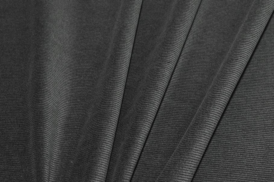 Il tessuto di velluto è un prodotto principalmente riconoscibile per il suo aspetto caratterizzato dalla superficie a coste composta da sottili righe di tessuto in rilievo. In questo caso la particolarità sta nella colorazione della stoffa poiché le coste sono grigie, mentre il fondo è nero. Questo lieve contrasto crea un grazioso e delicato effetto cangiante. Un'altra caratteristica nota è la mano molto morbida, tipica delle stoffe vellutate.