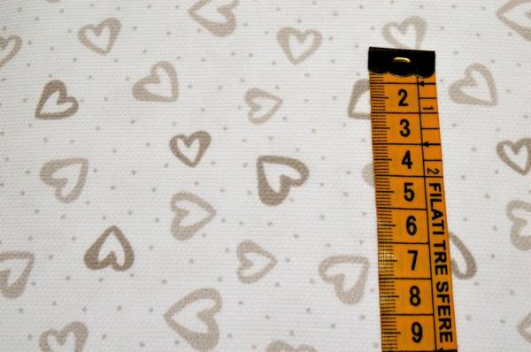 La prima variante del tessuto presenta un fondo bianco decorato da cuoricini beige a contrasto. La seconda fantasia invece ricrea lo stesso disegno ma con i colori invertiti dove il fondo è beige ed i cuori sono bianchi.