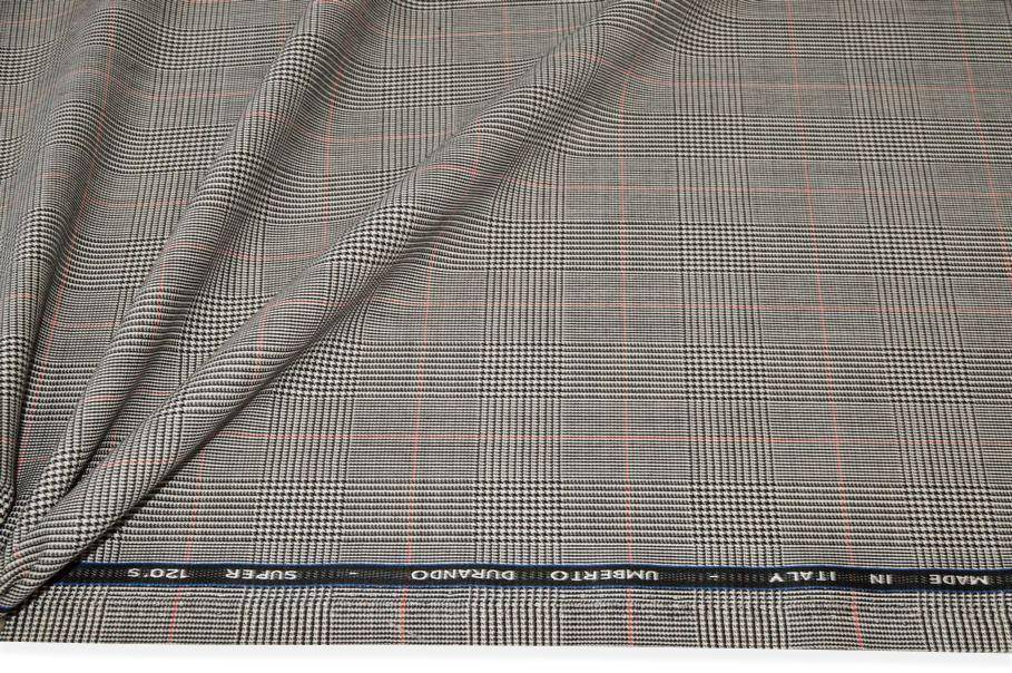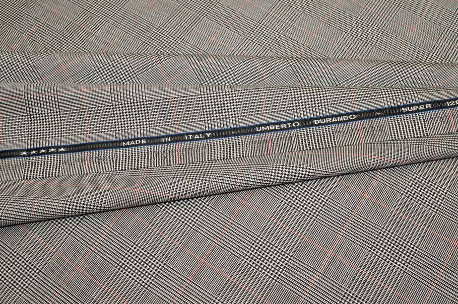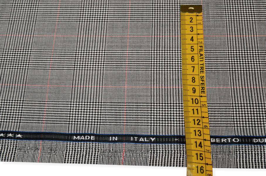 Il fondo presenta un bellissimo principe di galles bianco e nero con riquadro rosso, un originale dettaglio a contrasto che rende la stoffa unica nel suo genere. Adatto per modelli maschili e femminili ed è possibile indossarlo sia di giorno che di sera. Misura scacco 2,8x4 cm.