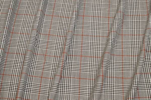 La scelta del design ricade su un elegante ed iconico principe di galles bianco e nero, arricchito dalla riga a contrasto color bruciato. Di grammatura media si presta perfettamente per la creazione di completi abito uomo, tailleur donna, gilet, giacche, pantaloni e gonne. Misura scacco bruciato 8,3x9,5 cm.