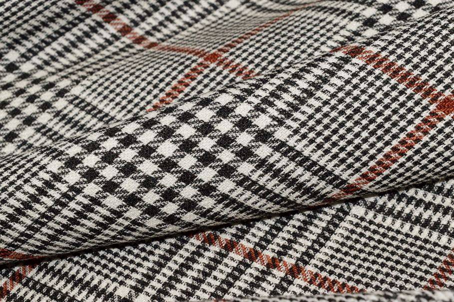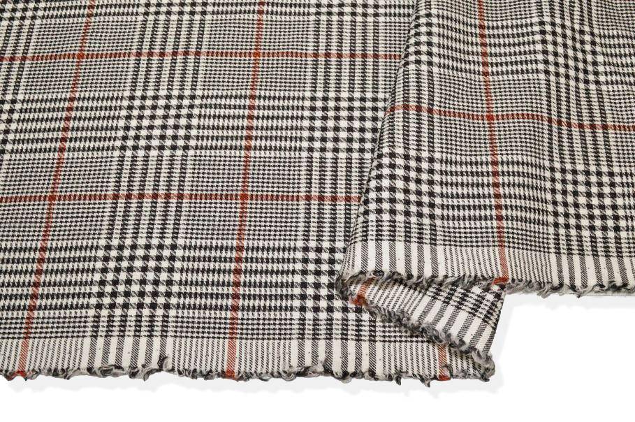 La scelta del design ricade su un elegante ed iconico principe di galles bianco e nero, arricchito dalla riga a contrasto color bruciato. Di grammatura media si presta perfettamente per la creazione di completi abito uomo, tailleur donna, gilet, giacche, pantaloni e gonne. Misura scacco bruciato 8,3x9,5 cm.