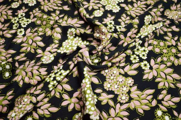 Il tessuto di pura viscosa trova principalmente impiego nelle stagioni primaverili ed estive poiché al tatto risulta essere molto morbido, traspirante e fresco. La sua leggerezza mette a disposizione un'ottima alternativa alle stoffe di cotone, ma nonostante la grammatura leggera riesce ugualmente ad offrire una buona coprenza durante l'indosso. Un'altra caratteristica molto apprezzata è la mano cadente e svolazzante la quale si presta perfettamente per abiti sinuosi o con modelli drappeggiati. Il design si presenta semplice, ma giovanile e sbarazzino allo stesso tempo dove l'intensità del fondo nero viene armoniosamente unita alla brillantezza dei motivi fiorati verdi e rosa. Oltre agli abiti questo prodotto si presta perfettamente anche per la creazione di gonne corte e lunghe, camicette, bluse e pantaloni morbidi.