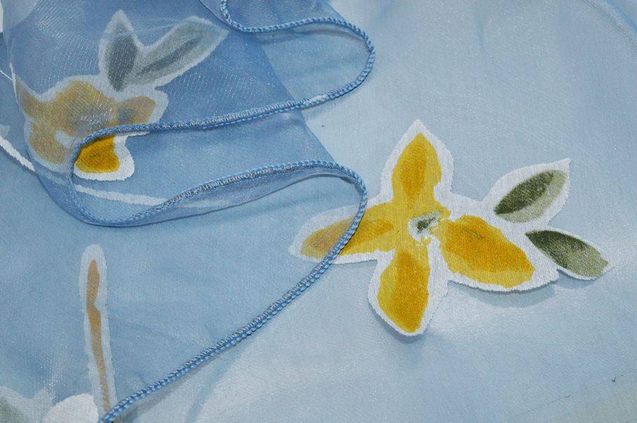Splendido tessuto con leggero fondo in organza dall'aspetto cadente e molto trasparente. La base viene particolarizzata dalla delicata colorazione azzurra unita a dettagli coprenti floreali di differenti forme e gradazioni di giallo ed arancio. Ideale per realizzare tende doppie e/o arricciate di ogni tipologia.