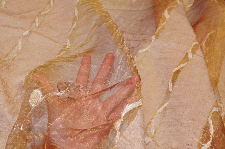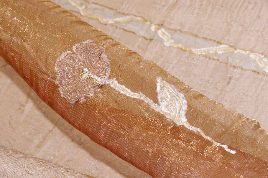 Un'altro pregio di questo prodotto è il design semplice, ma elegante che consiste in un fondo di organza stropicciata a fasce beige e color rame arricchite da ricami floreali in fill coupe. Indicato per realizzare tende arricciate per saloni e camere da letto dallo stile classico.