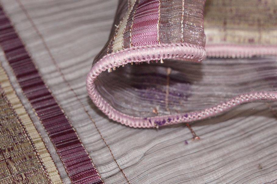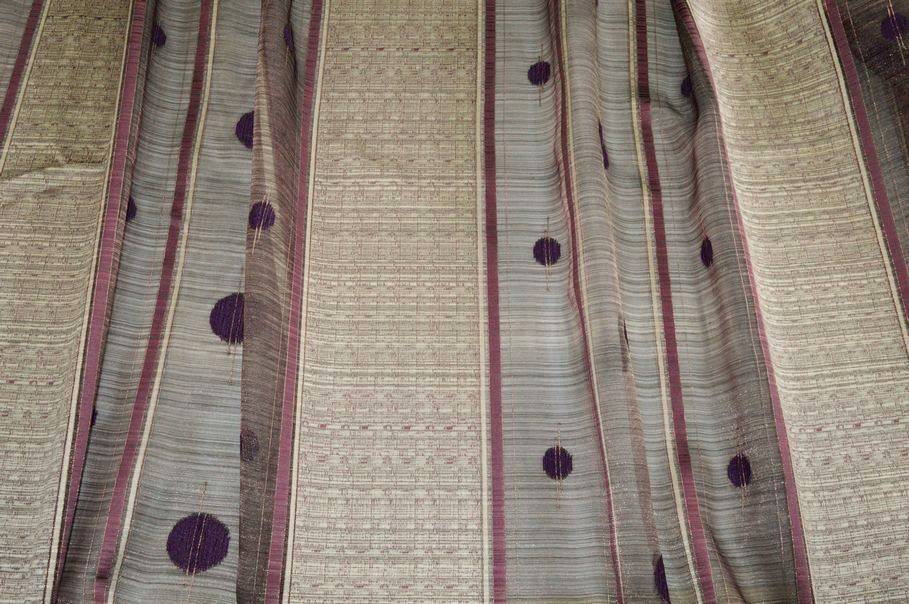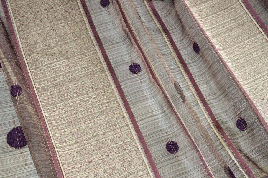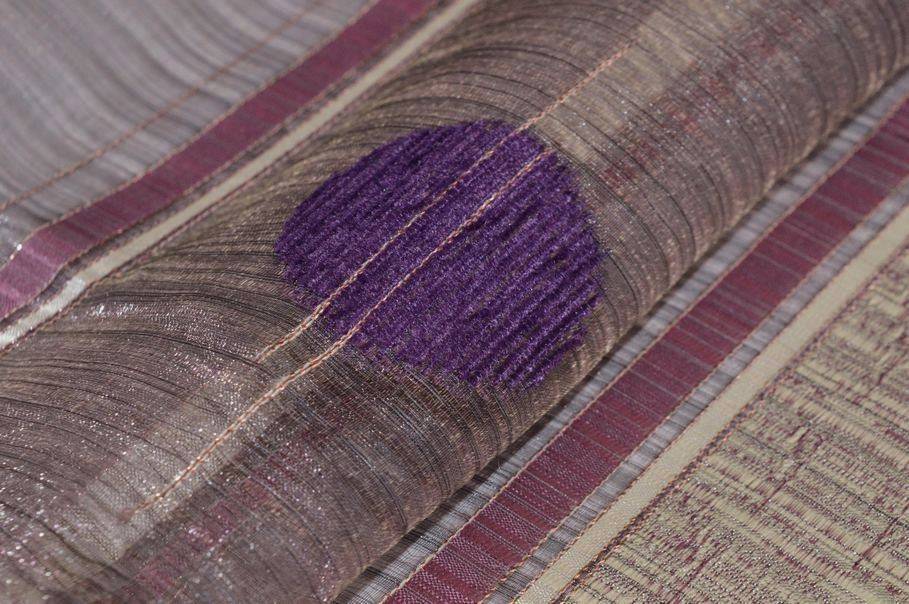 Tessuto in organza ideato per la confezione di tendaggi. Questo prodotto si contraddistingue per la sua particolare struttura composta da alcune fasce realizzate con una doppia organza che al suo interno racchiude sottili filati orizzontali che danno vita ad un design unico nel suo genere. A creare movimento troviamo inoltre particolari bolli ricamati viola in ciniglia.