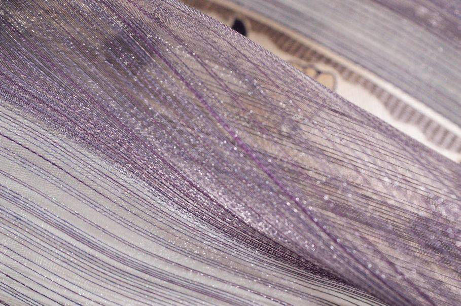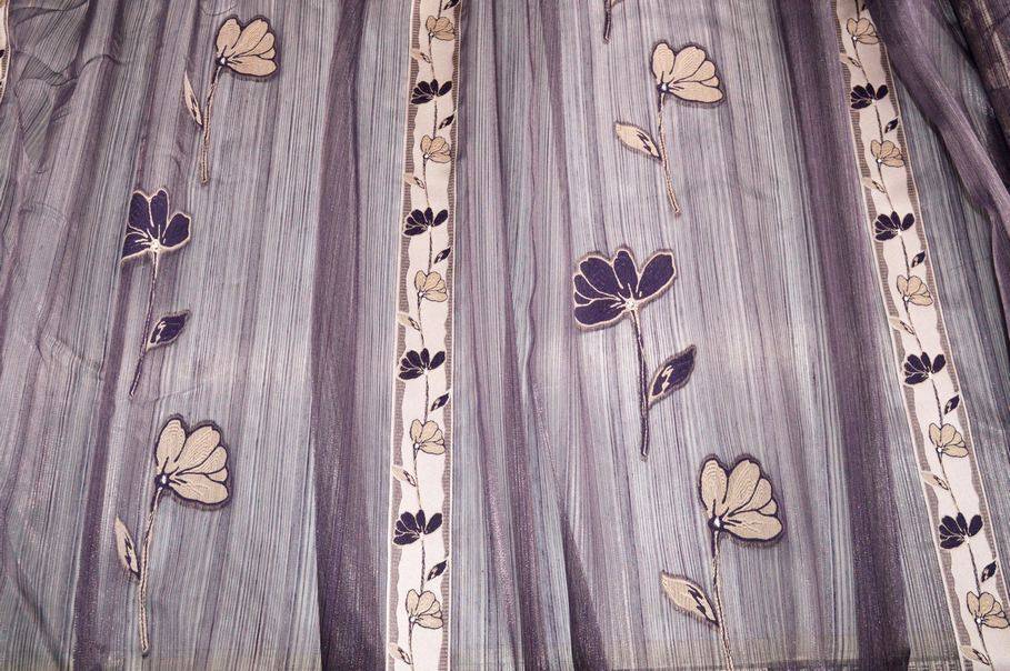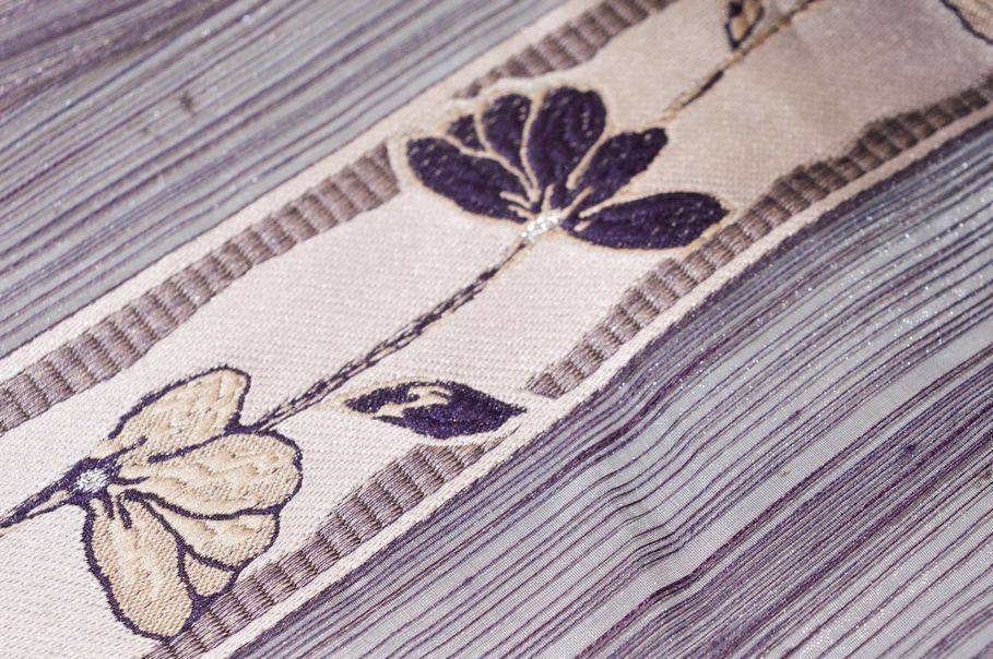 Il fondo viene realizzato con della bellissima organza viola decorata da fasce coprenti. Le fasce mettono in mostra un raffinatissimo ricamo beige e viola a tema floreale. Preziosa ed elaborata, ma allo stesso tempo classica ed elegante rappresenta un vero e proprio elemento d'arredo altamente lussuoso. Realizzato con base in organza presenta una mano molto leggera e trasparente. La leggerezza del prodotto lo rende un articolo perfetto per arredare ambienti con poca illuminazione.