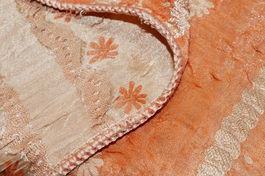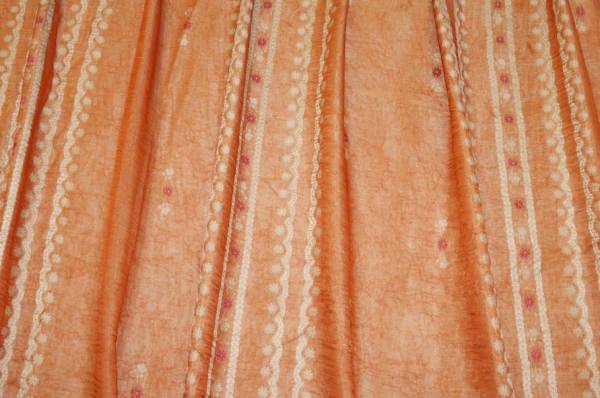 La particolarità di questo tessuto per tende sta nella sua struttura ottenuta dall'unione di due strati di stoffa. Il primo livello viene realizzato in leggera organza dall'aspetto luminoso e trasparente. Presenta una bellissima colorazione arancione impreziosita da piccoli fiorellini rossi. Il secondo strato ha sempre una mano molto morbida e cadente, ma coprente. Ha una delicata colorazione beige abbastanza luminosa ed unito all'organza arancione crea raffinati ricami floreali.