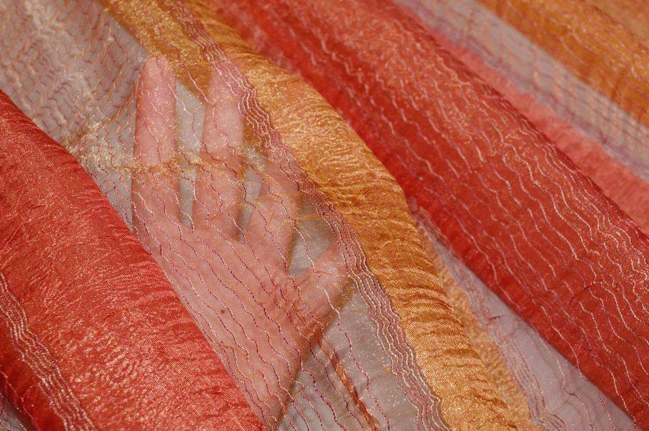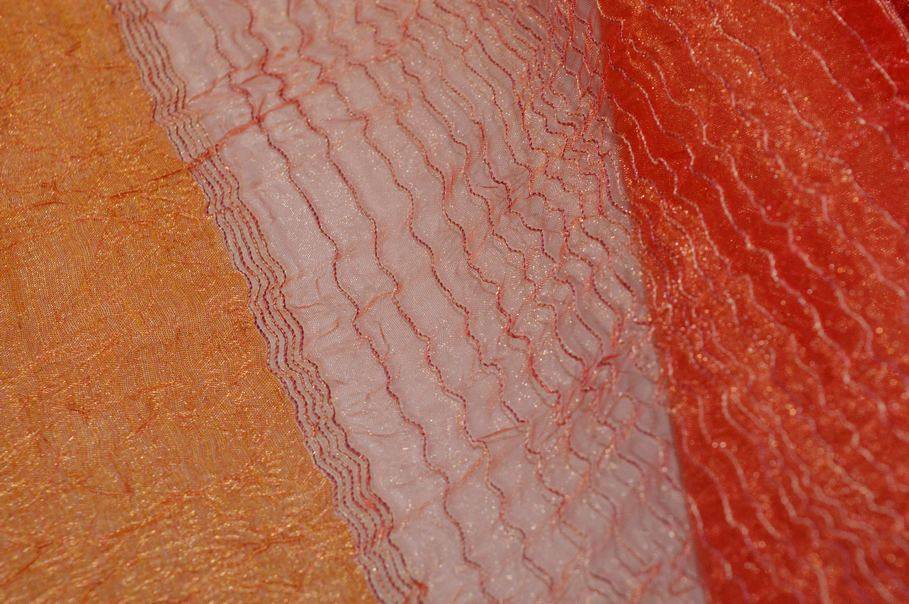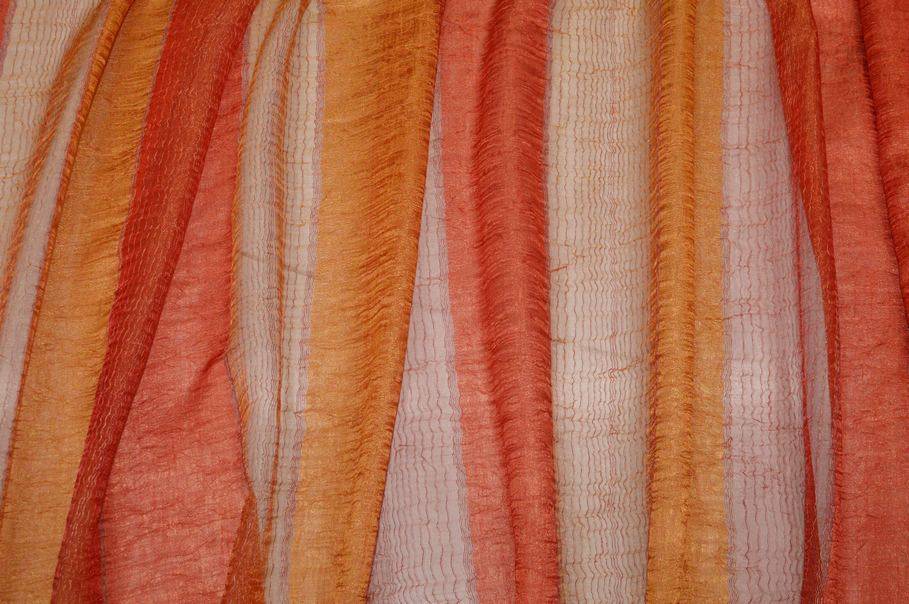 Tessuto per tende realizzato su base in organza suddivisa in fasce più e meno coprenti color giallo/oro ed arancio molto intenso (quasi rossiccio).