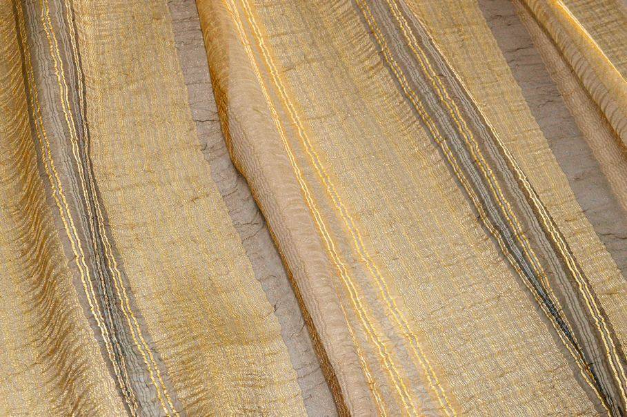 Un'altro pregio di questo prodotto è il design molto particolare. Il fondo viene suddiviso in sottili righe irregolari oro e blu che creano una bellissima sfumatura. Ad impreziosire ancora di più la stoffa è l'aspetto luminoso che, a seconda delle luce, crea splendidi riflessi. Indicato per realizzare tende arricciate per saloni e camere da letto dallo stile classico.
