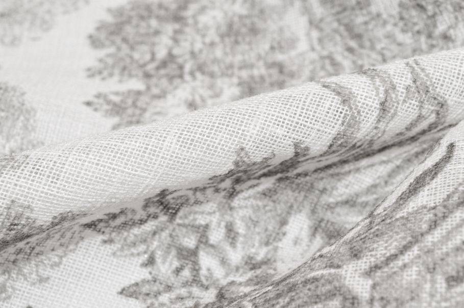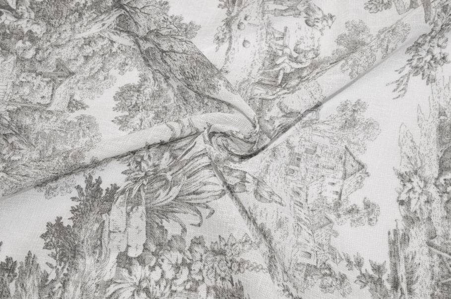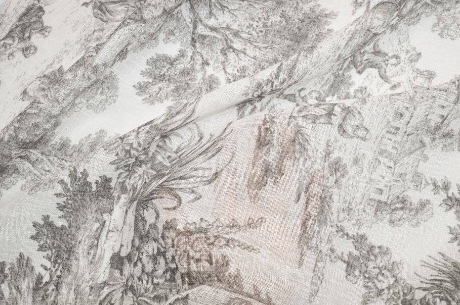 La fantasia toile de jouy sfoggia l'inconfondibile paesaggio pastorale nella variante colore grigio. Indicato per tendini a vetro per sala, veranda e cucina.