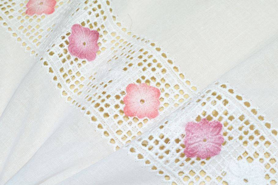 Tendino a vetro di colore bianco naturale decorato da graziosi incassi in pizzo con fiori rosa fragola e malva. La base presenta una leggera trama misto lino dalla mano leggera, semicoprente e filtrante alla luce. Nella zona superiore della tenda ci sono degli occhielli dove si inseriscono le apposite astine per tendini a vetro (sia a molla che con ganci). Smerlato sul fondo. Necessita di cucitura soltanto ai lati dove viene effettuato il taglio.