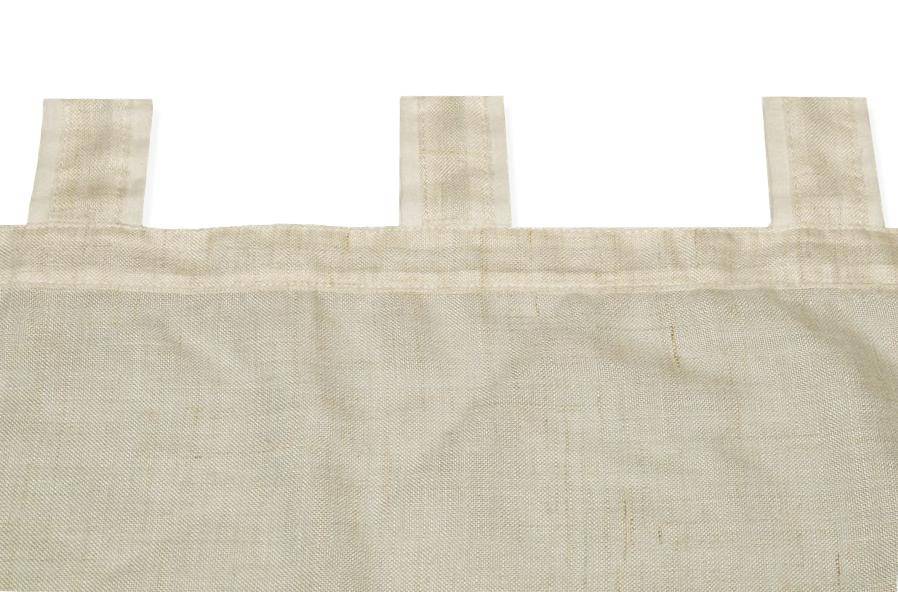 Ha una mano leggera, semicoprente e filtrante alla luce, per questo è perfetto per le aree della casa che hanno una scarsa illuminazione. Nella zona superiore ci sono degli anelli in stoffa che permettono l'inserimento delle apposite astine per tendini a vetro (sia a molla che con ganci). Sul fondo invece è smerlato. Necessita di cucitura soltanto ai lati dove viene effettuato il taglio.