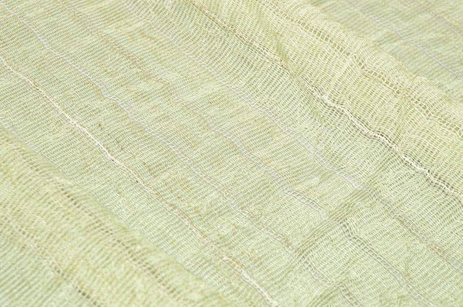 Tessuto indicato per la confezione di tende sia con onde morbide, sia con arricciature ricche e voluminose. La colorazione scelta per il fondo è un delicato verde chiaro che viene decorata da sottili righe verticali distanti 1,8 cm ciascuna. Un'altra particolarità del tessuto sta nella superficie pieghettata che va a creare il bellissimo effetto stropicciato. La trama effetto garza della stoffa ha una mano ariosa, semicoprente e filtrante alla luce, ottima per illuminare le stanze.