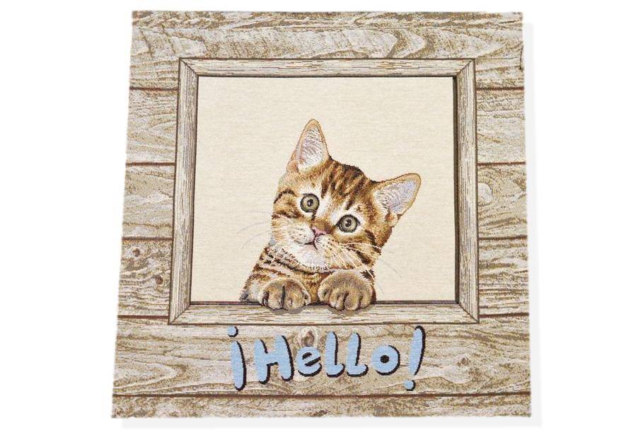 Tessuto raffigurante un grazioso gattino con scritta "Hello!" azzurra in Gobelin cm 47x47. Articolo utilizzato per realizzare graziosi copricuscini, sottopiatti, tovagliette e lavori di cucito creativo vario. Da rifinire sui quattro lati.