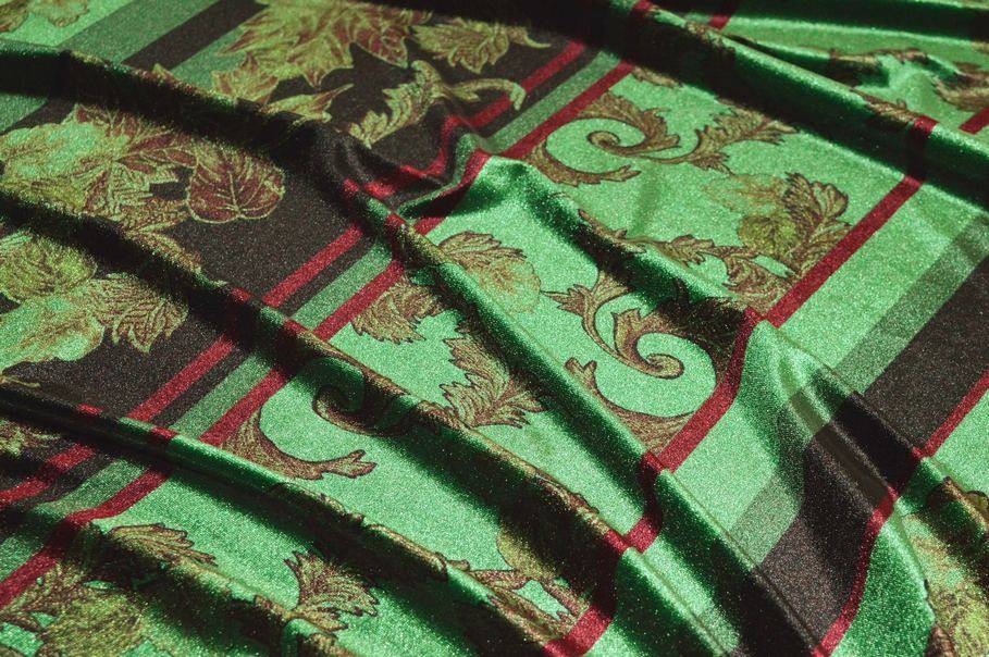Il fondo sfoggia un particolarissimo design ottenuto dalle linee orizzontali verdi abbinate a ghirigori giallo/oro a contrasto. Indicato per capi d'abbigliamento sia casual che eleganti come maglie, gonne lunghe ed abiti.
