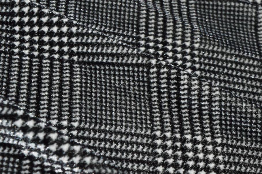 Il fondo viene abbellito dall'iconico disegno principe di galles bianco nero composto da scacchi di 4x4 cm ciascuno. Indicato per capi d'abbigliamento sia casual che eleganti come maglie, gonne ed abiti.