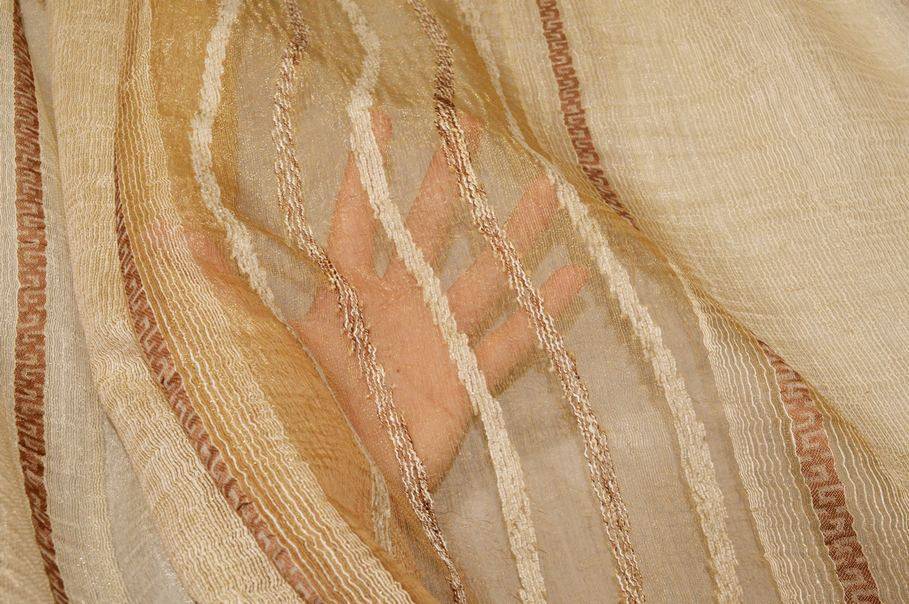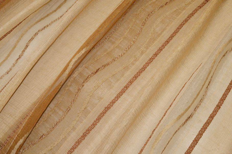 Un'altro pregio di questo prodotto è il design semplice, ma originale che consiste in un fondo di organza suddiviso in fasce irregolari di differente coprenza, colore e larghezza. Questa caratteristica dona movimento al fondo della stoffa dando vita ad un pezzo d'arredamento unico nel suo genere. Molto bella è anche la scelta dei colori che unisce armoniosamente numerose gradazioni di beige/dorato e marrone. Indicato per realizzare tende arricciate per saloni e camere da letto dallo stile classico.