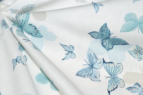 Bellissimo tessuto Panama interamente naturale realizzato in puro cotone. Il fondo presenta una base bianca impreziosita dal grazioso e delicato disegno raffigurante piccole farfalle azzurre, ottanio e beige. Idealizzato per confezionare tovagliati, lavori di arredo cucina come presine ed oggettistica varia ed altri progetti di cucito creativo.