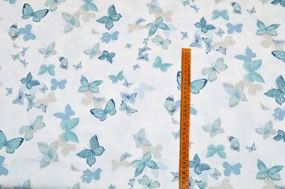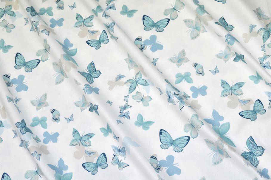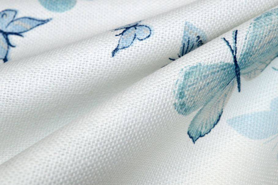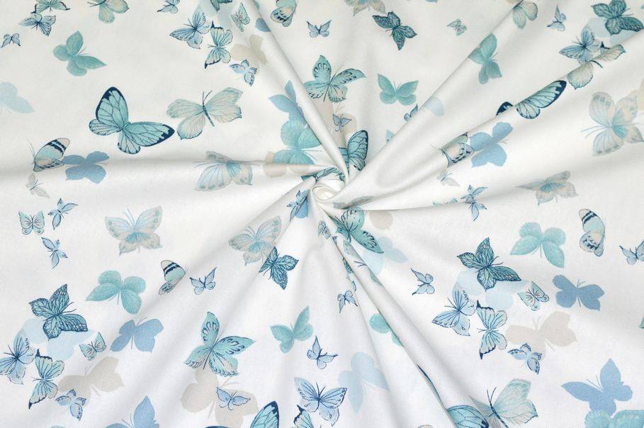 Bellissimo tessuto Panama interamente naturale realizzato in puro cotone. Il fondo presenta una base bianca impreziosita dal grazioso e delicato disegno raffigurante piccole farfalle azzurre, ottanio e beige. Idealizzato per confezionare tovagliati, lavori di arredo cucina come presine ed oggettistica varia ed altri progetti di cucito creativo.