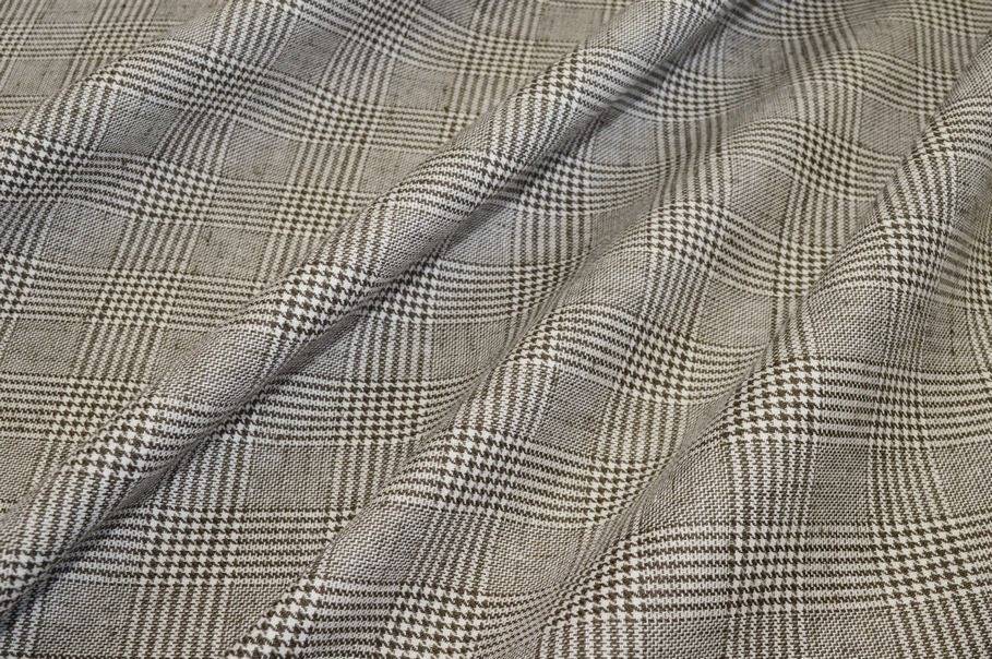 Tessuto ottenuto dalla lavorazione di filati di puro lino mescolati con un 20%di viscosa i quali mettono a disposizione un prodotto totalmente naturale. Questo lino presenta una trama fitta, ma riesce ugualmente a garantire un'ottima traspirabilità durante l'indosso rendendolo confortevole ed agevole. Sul rovescio è già applicata la telina termoadesiva che aggiunge corposità e struttura alla stoffa. Il fondo presenta l'iconico motivo principe di galles beige il quale conferisce al tessuto un aspetto classico ma sempre attuale e di classe, che si adatta perfettamente anche alle ultime tendenze. La sua consistenza e grammatura pesante ne finalizzano l'uso prevalentemente per capispalla uomo/donna come giacche, tailleur e gonne.