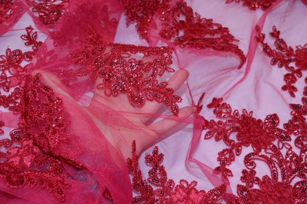 Questo tessuto tulle ricamato è una scelta elegante e sofisticata, ideale per abiti da sposa, da cerimonia e per eventi formali. La sua base in tulle trasparente è impreziosita da un ricamo floreale in rilievo che dona al tessuto un aspetto di classe, mentre le cimose smerlate su entrambi i lati aggiungono un tocco ulteriore di raffinatezza. La sua morbidezza e la caduta fluida lo rendono perfetto per creare abiti che avvolgono il corpo con grazia, ed è l'ideale anche per realizzare capi con dettagli vedo/non vedo, grazie alla trasparenza delicata. Inoltre, il tessuto è arricchito da paillettes cucite con cura, che aggiungono un raffinato brillio rendendo ogni creazione ancora più preziosa ed elegante.