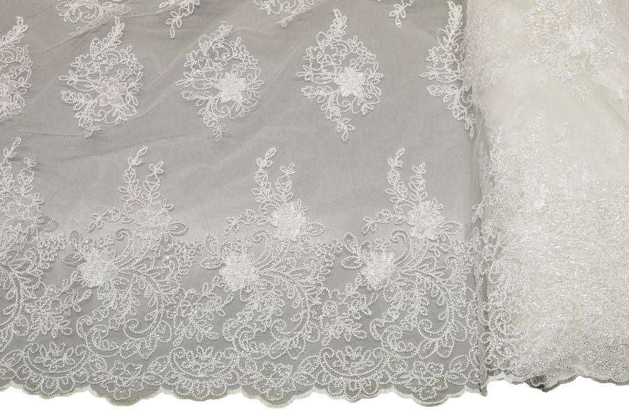 Questo tessuto tulle ricamato è una scelta elegante e sofisticata, ideale per abiti da sposa, da cerimonia e per eventi formali. La sua base in tulle trasparente è impreziosita da un ricamo floreale in rilievo che dona al tessuto un aspetto di classe, mentre le cimose smerlate su entrambi i lati aggiungono un tocco ulteriore di raffinatezza. La sua morbidezza e la caduta fluida lo rendono perfetto per creare abiti che avvolgono il corpo con grazia, ed è l'ideale anche per realizzare capi con dettagli vedo/non vedo, grazie alla trasparenza delicata. Inoltre, il tessuto è arricchito da paillettes cucite con cura, che aggiungono un raffinato brillio rendendo ogni creazione ancora più preziosa ed elegante.
