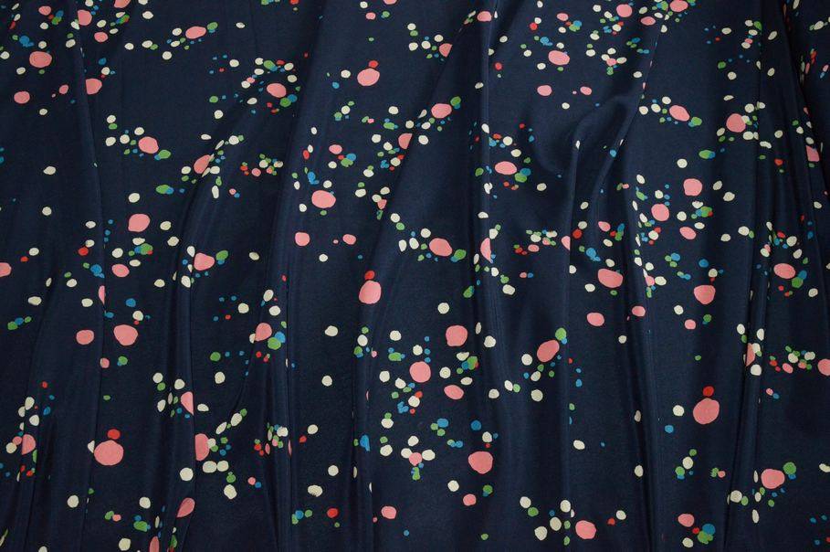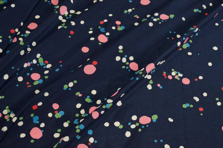 Tessuto crepe de chine realizzato in pura seta, una fibra completamente naturale che conferisce al materiale una mano morbida, leggera e fresca, garantendo traspirabilità e comfort. Una volta indossato, il tessuto si distingue per la sua caduta fluida e svolazzante, rendendolo ideale per capi primaverili ed estivi. Il design presenta un elegante fondo blu notte impreziosito da punti di colore che ricordano schizzi di vernice, dando al tessuto un tocco giovanile e vivace.