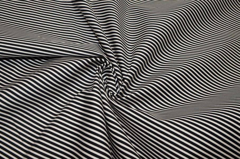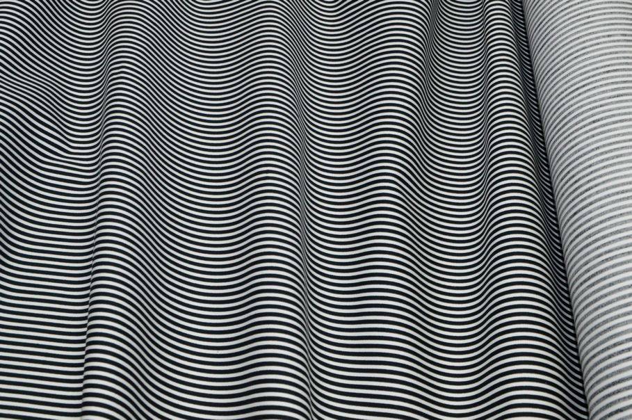 Il fondo del tessuto sfoggia una fantasia effetto optical, creata dall’accostamento di righe orizzontali bianche e nere che genera un effetto visivo deciso e originale. Perfetto per giacchette e gonne abbinate tra loro, per pantaloni, corsetti ed abiti.